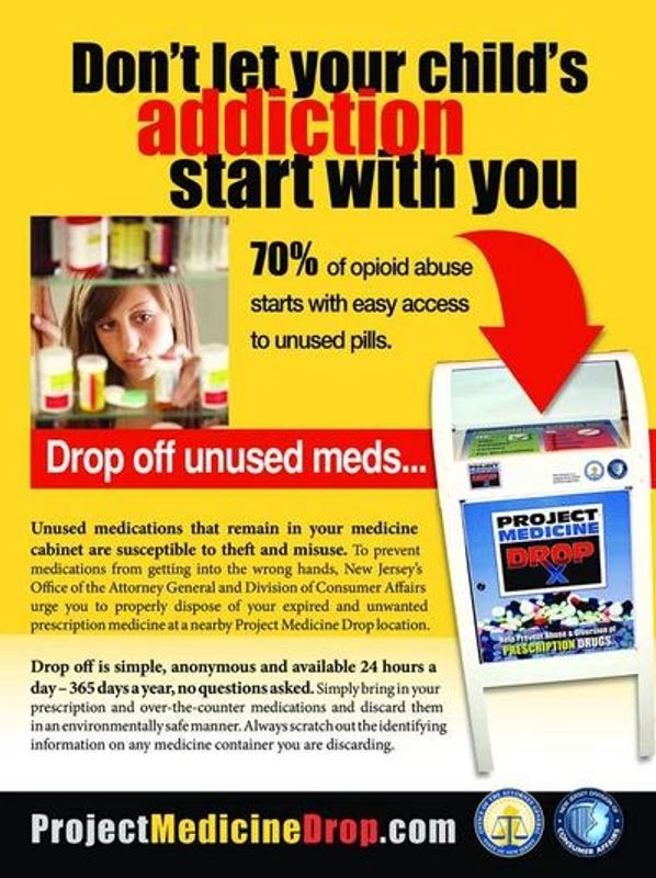 By giving New Jerseyans a safe and secure method to dispose of unneeded medications, Project Medicine Drop helps prevent the abuse of these drugs. This initiative also protects New Jersey’s environment by keeping these drugs out of landfills and out of the water supply.